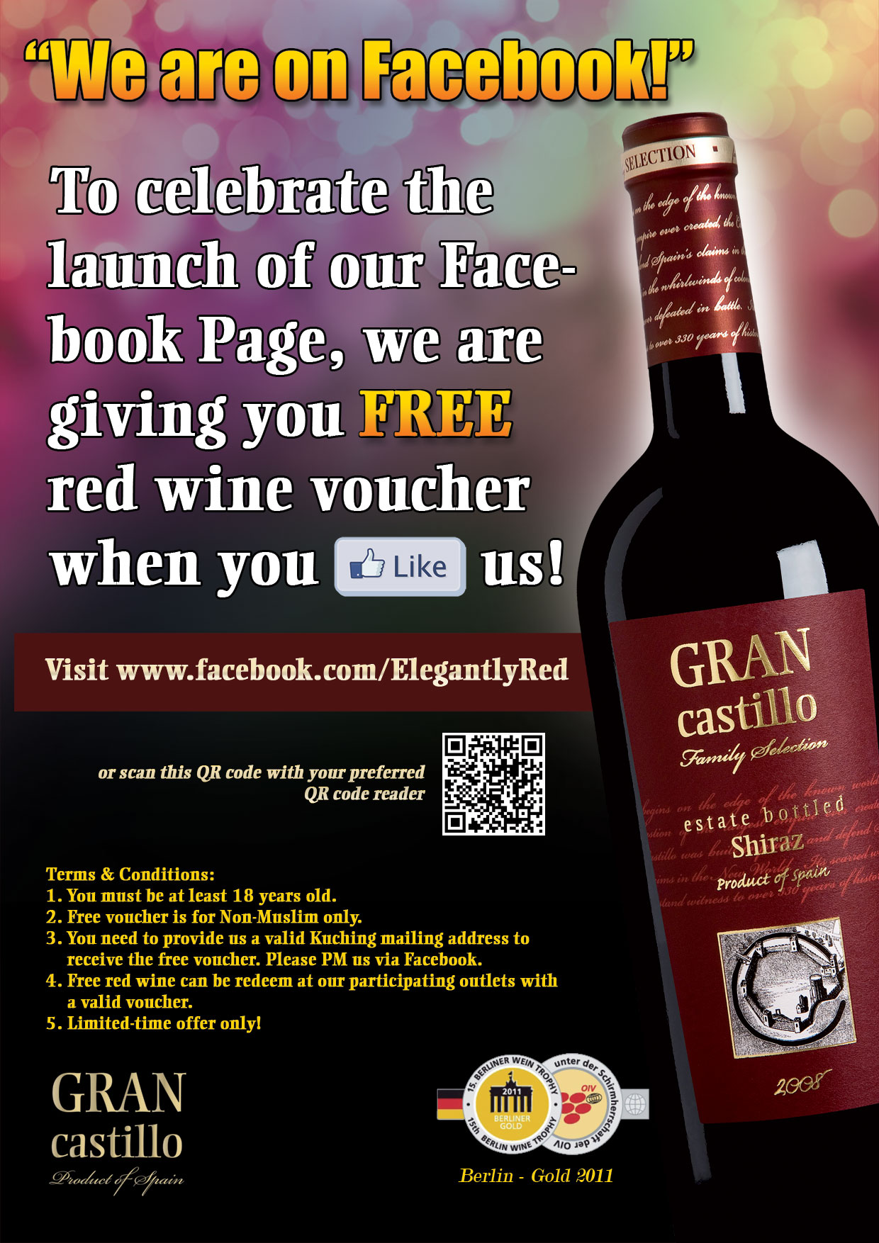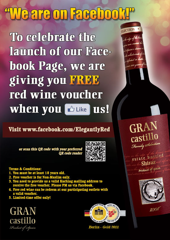 A: Easy. First, login to www.facebook.com/ElegantlyRed and "LIKE" our page. Or, you can use your preferred QR Code reader on your smart phone to scan the QR Code above for quickier access! After that, send us a Private Message (PM) with your home address in Kuching so that we can send you the voucher. That's all!